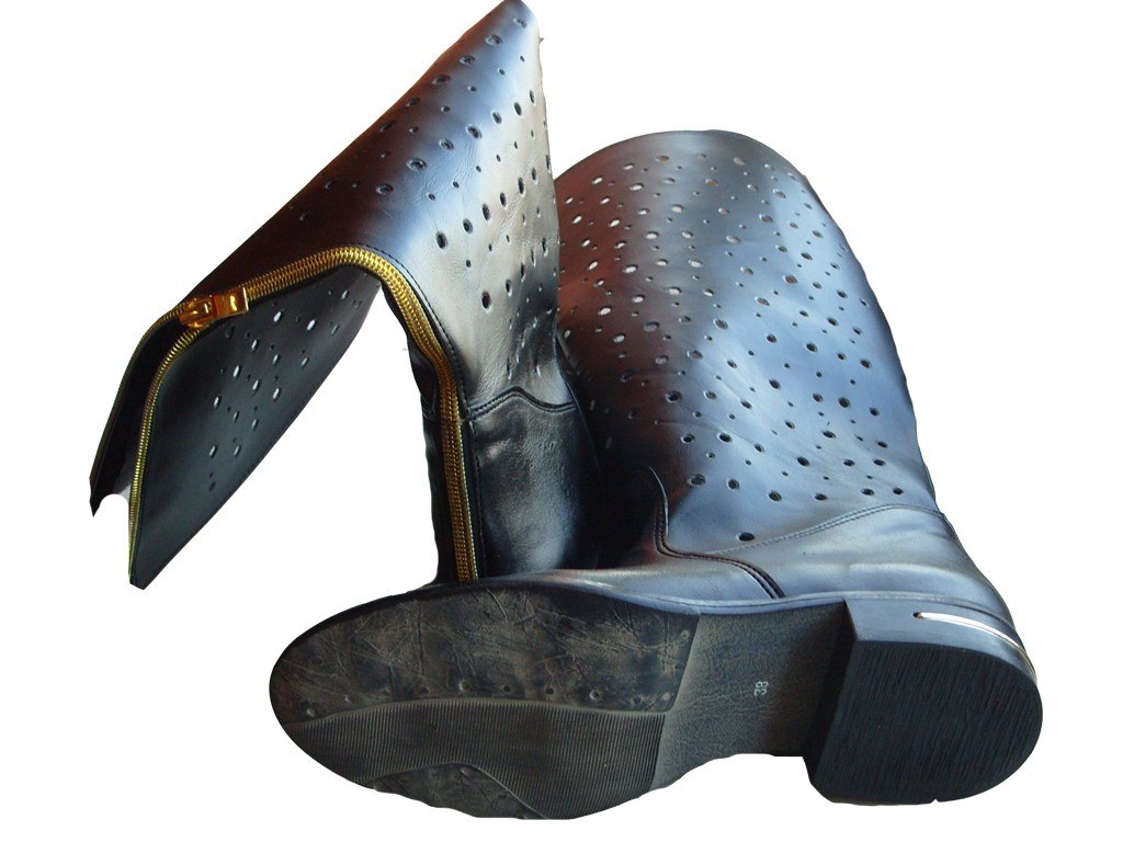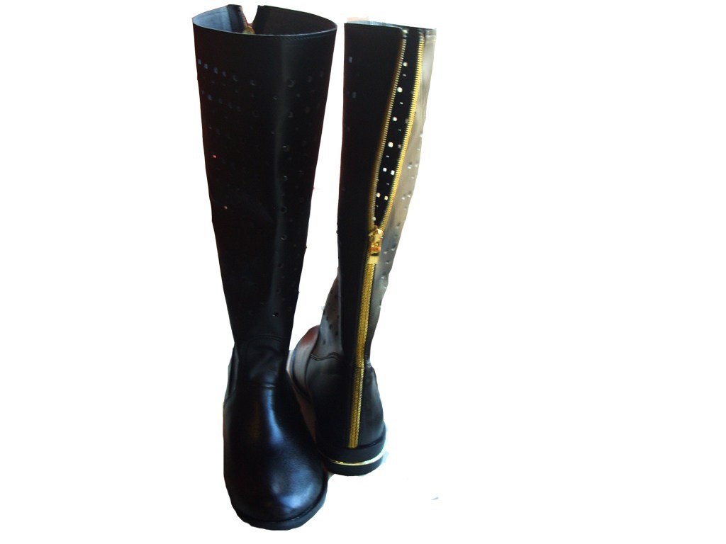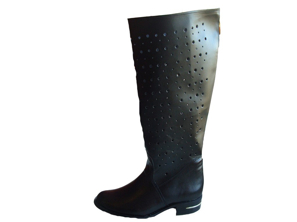 Prezentujemy modne, wygodne i oryginalne kozaki na szerokie łydki. Zostały one wykonane z wysokiej jakości czarnej skóry ekologicznej, co nadaje im klasycznego charakteru. Ich cholewka sięga pod kolano, a jej wysokość wynosi około 40 cm w najwyższym punkcie. Wyposażone są w ażurowe zdobienia oraz stabilny, szeroki obcas o wysokości 3 cm.