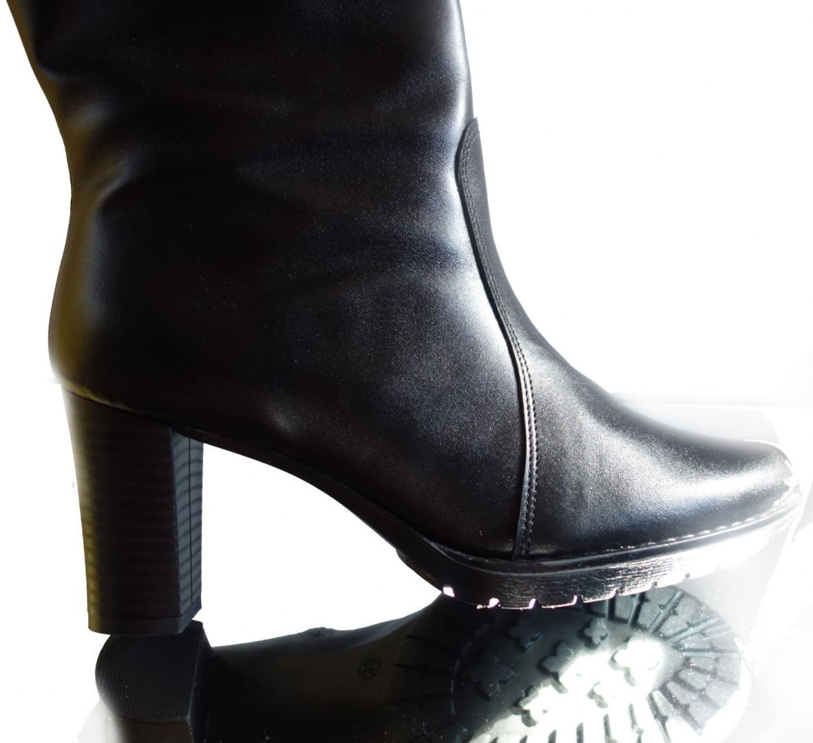 Te kozaki skórzane są dostępne w kolorze czarnym, w rozmiarze 38. Posiadają również szereg parametrów, takich jak odporność na wodę, wbudowane ocieplenie, czy wygodny nosek migdałowy.