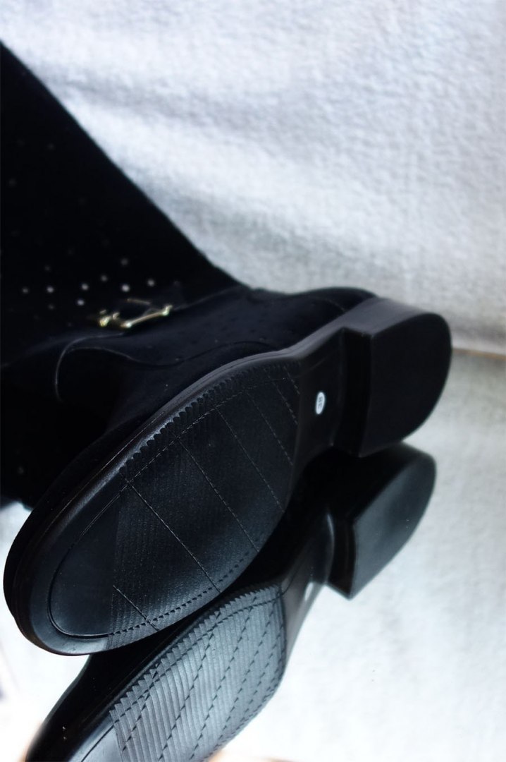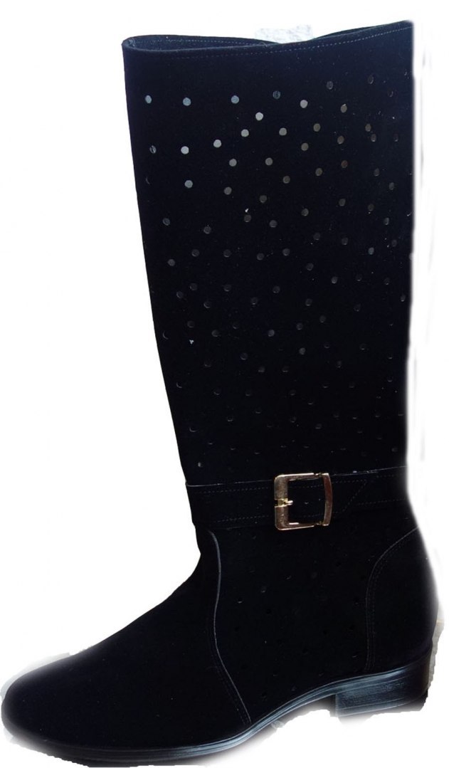 Prezentujemy Państwu modne, wygodne i oryginalne kozaczki ażurowe z wysoką cholewką, stworzone specjalnie dla osób o szerszych łydkach. W najszerszym miejscu mają one obwód wynoszący 46 cm, dzięki czemu zapewniają idealne dopasowanie. Wykonane z czarnej ekoskóry zamszowej, te eleganckie kozaczki o klasycznym stylu są zdobione dziurkami, a obcas o wysokości 3 cm zapewnia stabilność i komfort. Z boku znajduje się zamek błyskawiczny w kolorze czarnym, umożliwiający łatwe zakładanie butów.