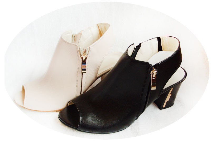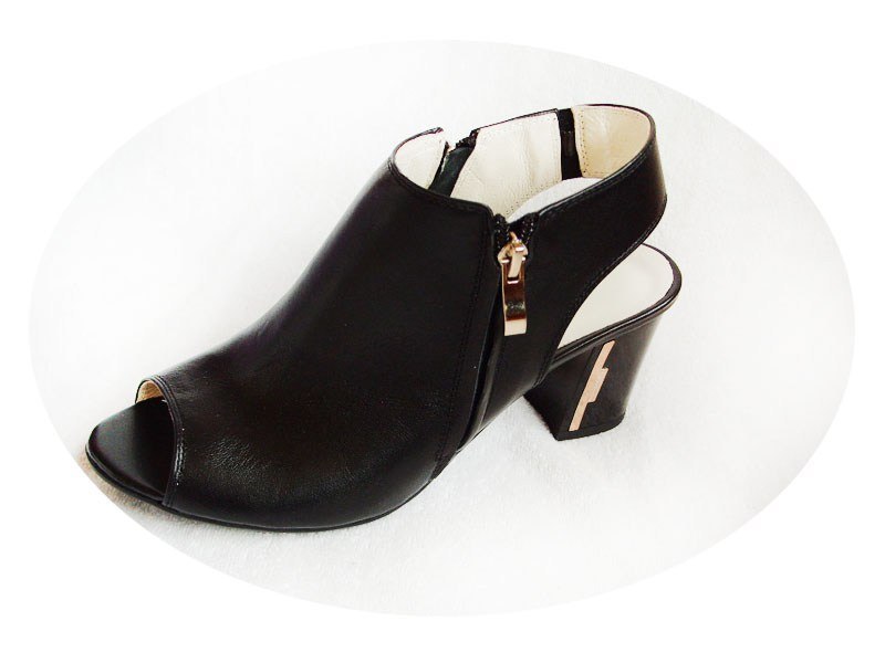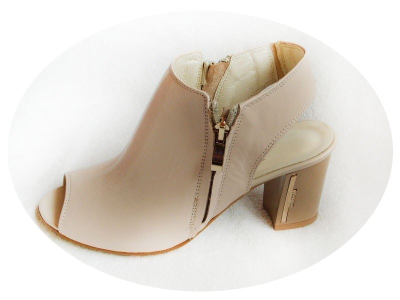 Buty są wycinane z przodu i z tyłu, co nadaje im oryginalnego charakteru. Po bokach znajdują się złote zamki, które można rozsuwać do samego końca. Całość prezentuje się niezwykle stylowo i elegancko, a wielką zaletą jest wygodny, szeroki obcas o wysokości 7,5 cm. Warto zaznaczyć, że bok obcasa nie posiada złotej ozdoby, jak na zdjęciu, jest jednak gładki, co dodaje mu kunsztu i delikatności.