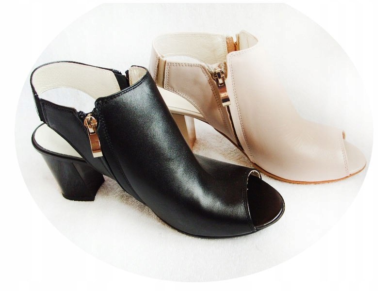 Sandałki zostały starannie wykonane z wysokiej jakości skóry naturalnej, co gwarantuje ich trwałość i odporność na codzienne zużycie. Obuwie posiada wycięcia z przodu i z tyłu, dodając mu modny i atrakcyjny wygląd. Złote, rozsuwane zamki po bokach dodają charakteru sandałkom, a obcas o wysokości 7 cm nadaje im elegancji.