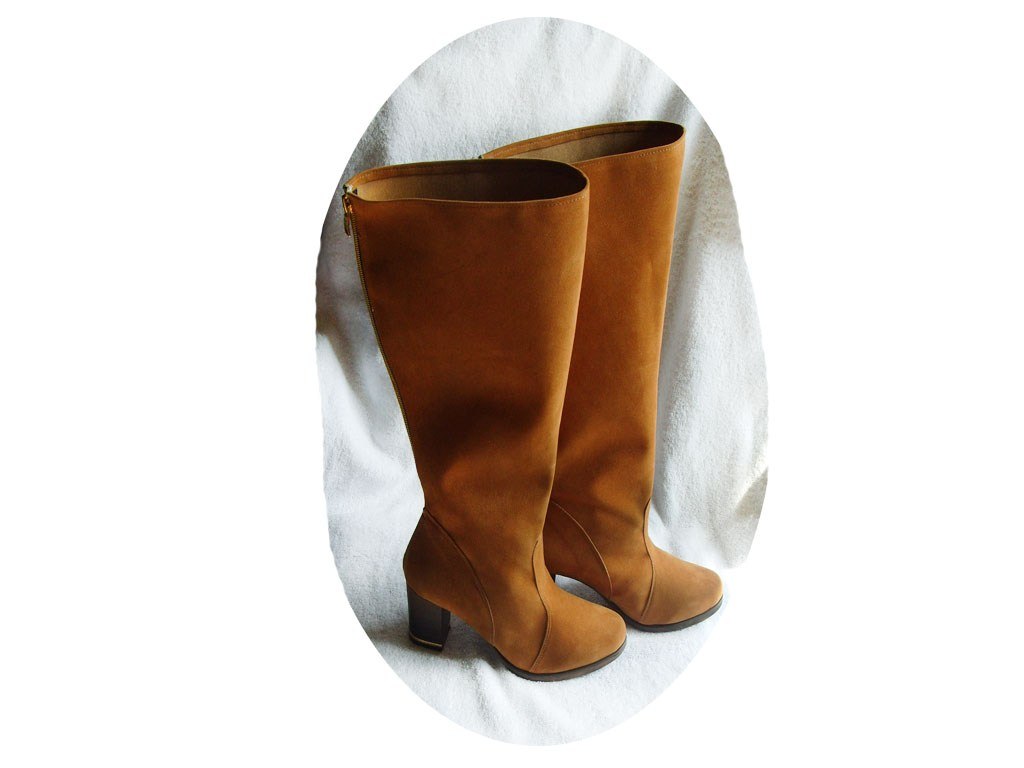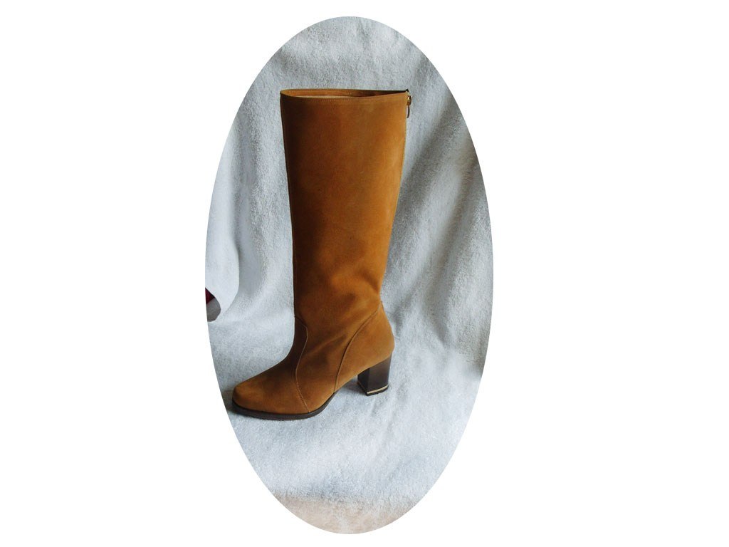 Kozaki są dostępne w różnych rozmiarach i mogą być personalizowane. Przy zamówieniu prosimy o podanie pomiarów, takich jak obwód łydki i wysokość cholewki, aby spełnić Państwa indywidualne preferencje. Wysoka, szeroka cholewka i stabilny obcas o wysokości 6,5 cm gwarantują wygodę i elegancję. Kozaki są dostępne w kolorze kamelowo-rudym, który jest łatwy w utrzymaniu czystości.
