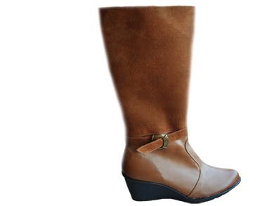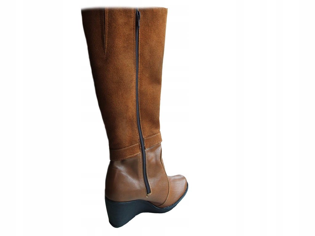 Modne i wygodne damskie kozaczki na koturnie, wykonane z wysokiej jakości skóry naturalnej w kolorze camel. Ten oryginalny model posiada wysoką cholewkę ozdobioną przeszyciami i klamrą, dodając elegancji i uroku. Mocne ocieplenie zapewnia komfort oraz ochronę przed zimnem.