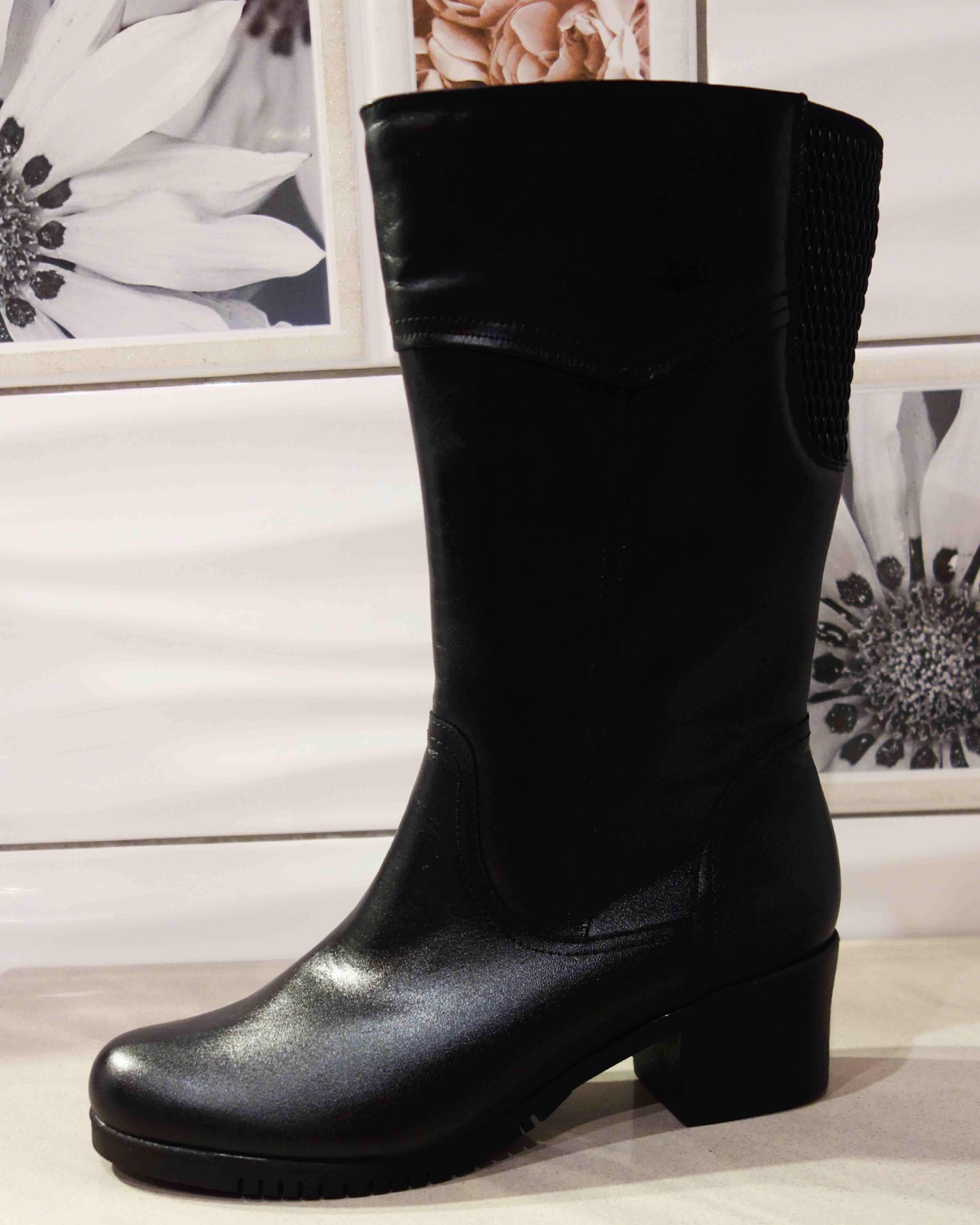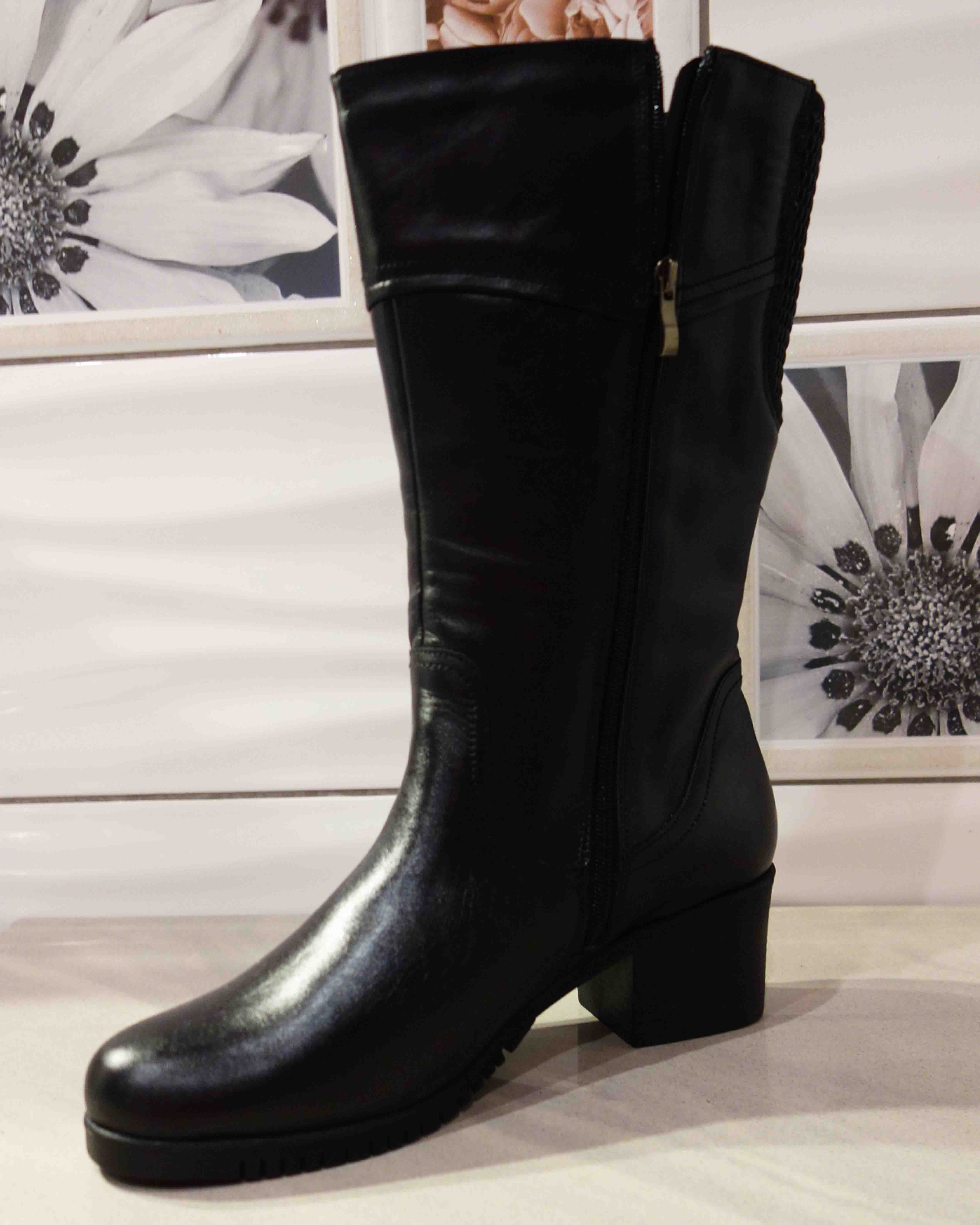 Wysokość cholewki tego modelu to 28,5 cm (bez obcasa), co sprawia, że sięga do połowy łydki. Dodatkowo, szeroki i stabilny obcas o wysokości 5,5 cm zapewnia stabilność i elegancję.