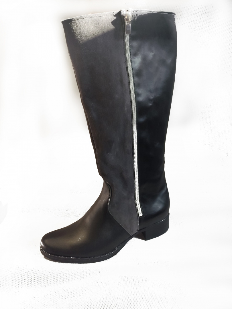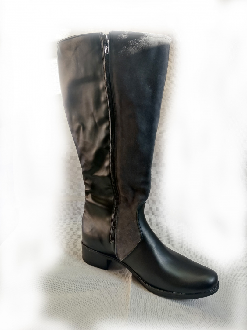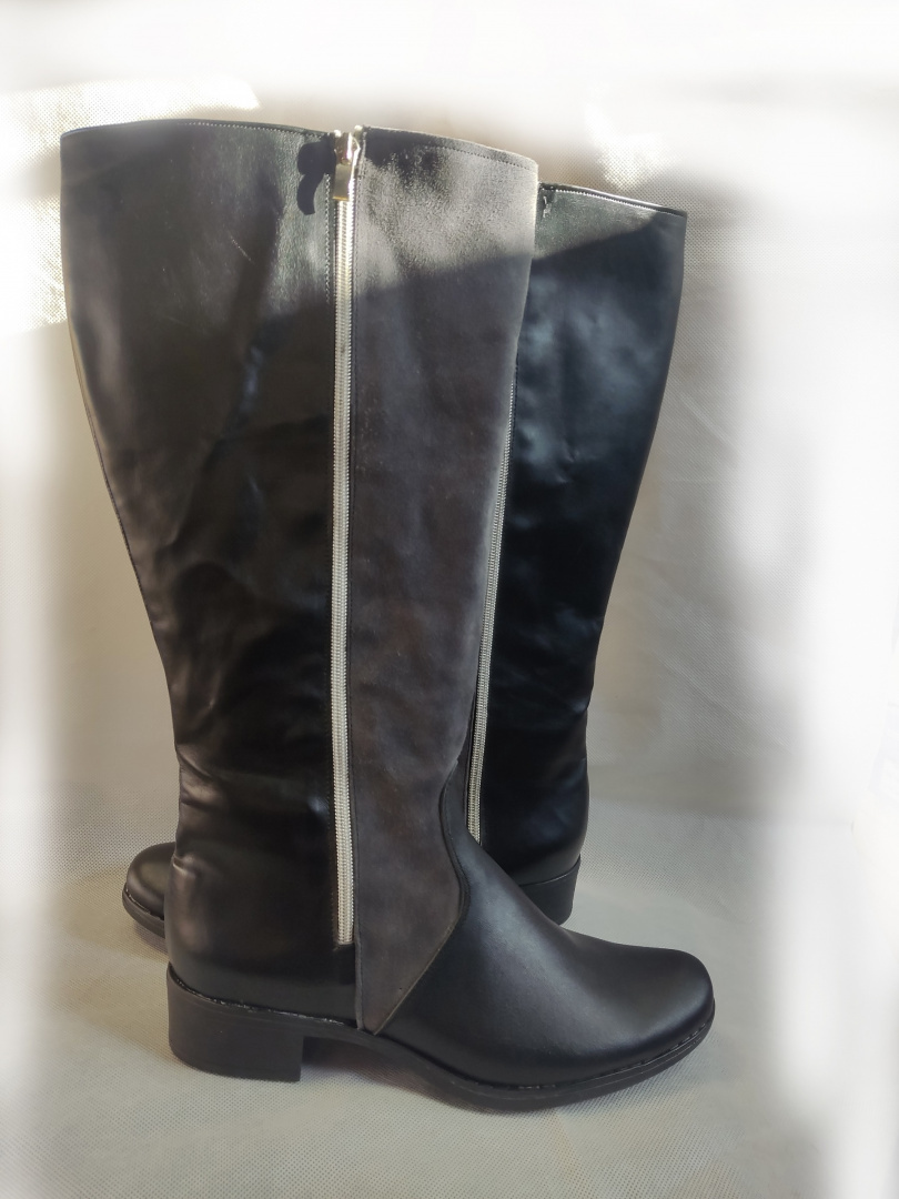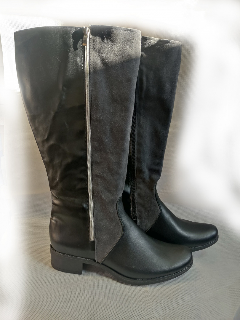 Przedstawiamy Państwu te modne i wygodne damskie kozaki z szeroką cholewką o wysokości aż 38 cm. Idealne na szerszą łydkę, te klasyczne kozaczki są wykonane ze skóry ekologicznej. Ich tylne części są pokryte szarym welurowym materiałem, natomiast przednie części są zrobione ze skóry naturalnej. To oferta dotyczy gotowej pary, która jest idealna do wysyłki.