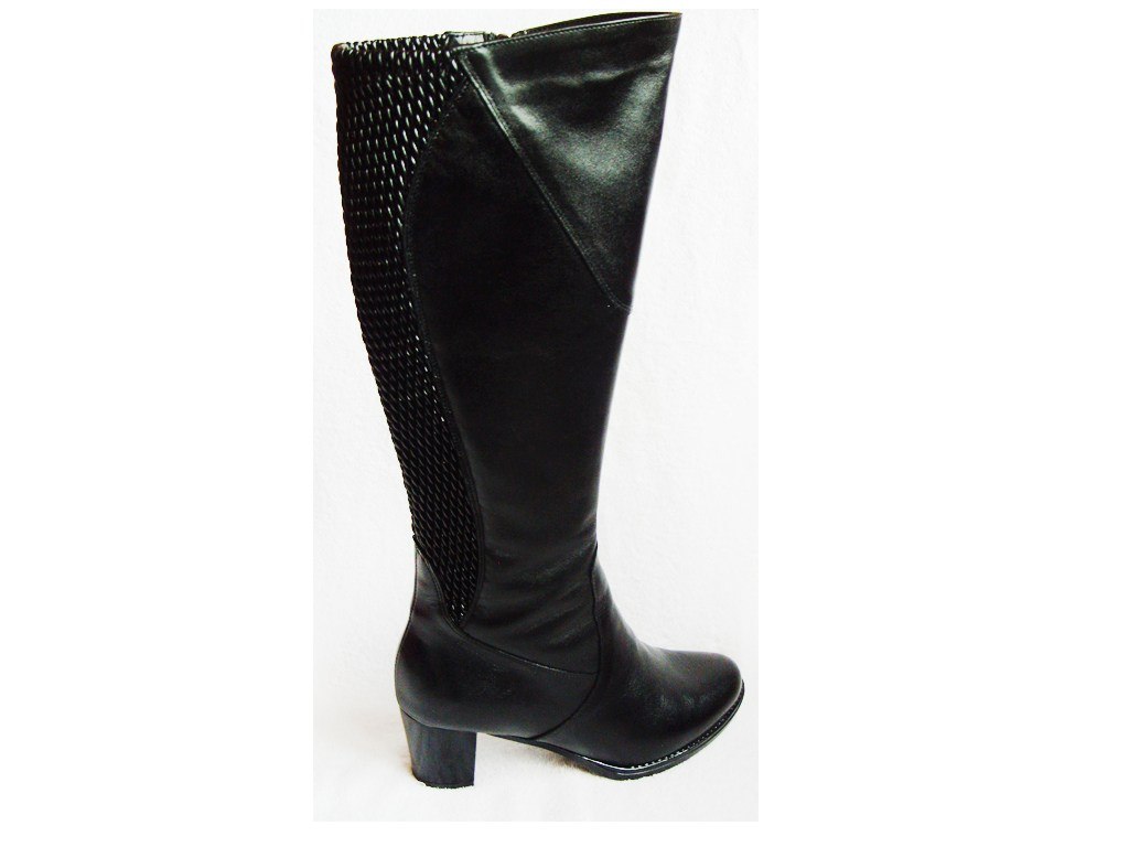 Wysokość cholewki sięga do kolana, co dodaje im szlachetności i elegancji. Z tyłu kozaków znajduje się ozdobna guma o efektownym splocie, która pozwala na idealne dopasowanie cholewki do szerszej łydki oraz kostki. Model ten jest dostępny w szerokich rozmiarach od 40 do 46, a także w różnych obwodach cholewki, dzięki czemu każdy może znaleźć idealne dopasowanie.