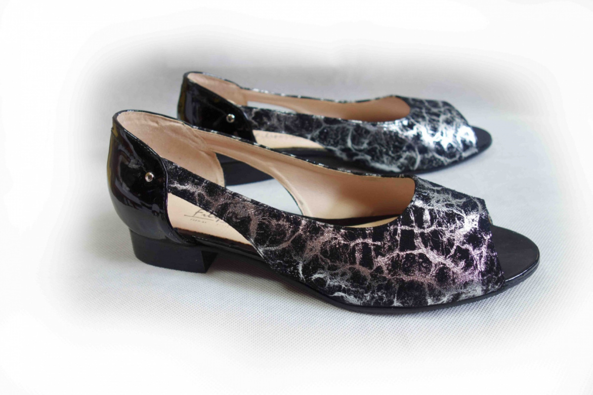 Oferujemy stylowe sandałki, które pozwolą Ci przejść daleko! Nasze baletki zostały wykonane z wysokiej jakości skóry naturalnej w kolorze czarnym, z dodatkami srebra z tyłu. Posiadają niski obcas o wysokości 2,5 cm, z wygodną zabudowaną piętą i odkrytymi palcami.