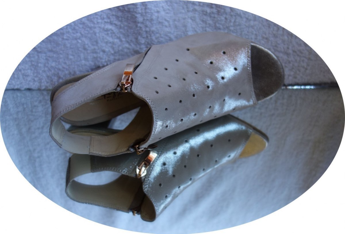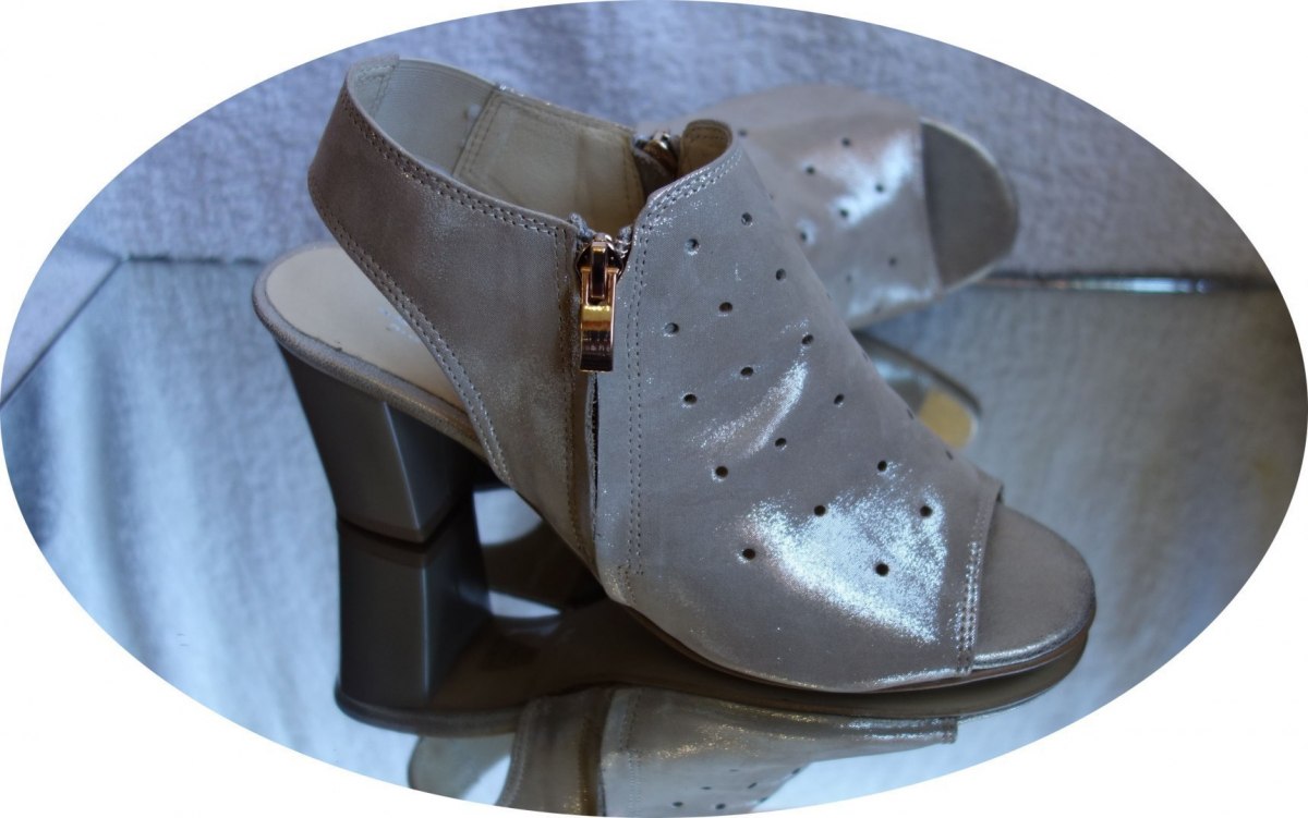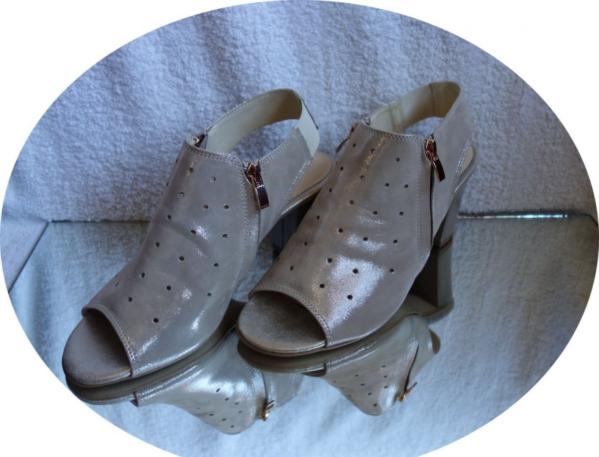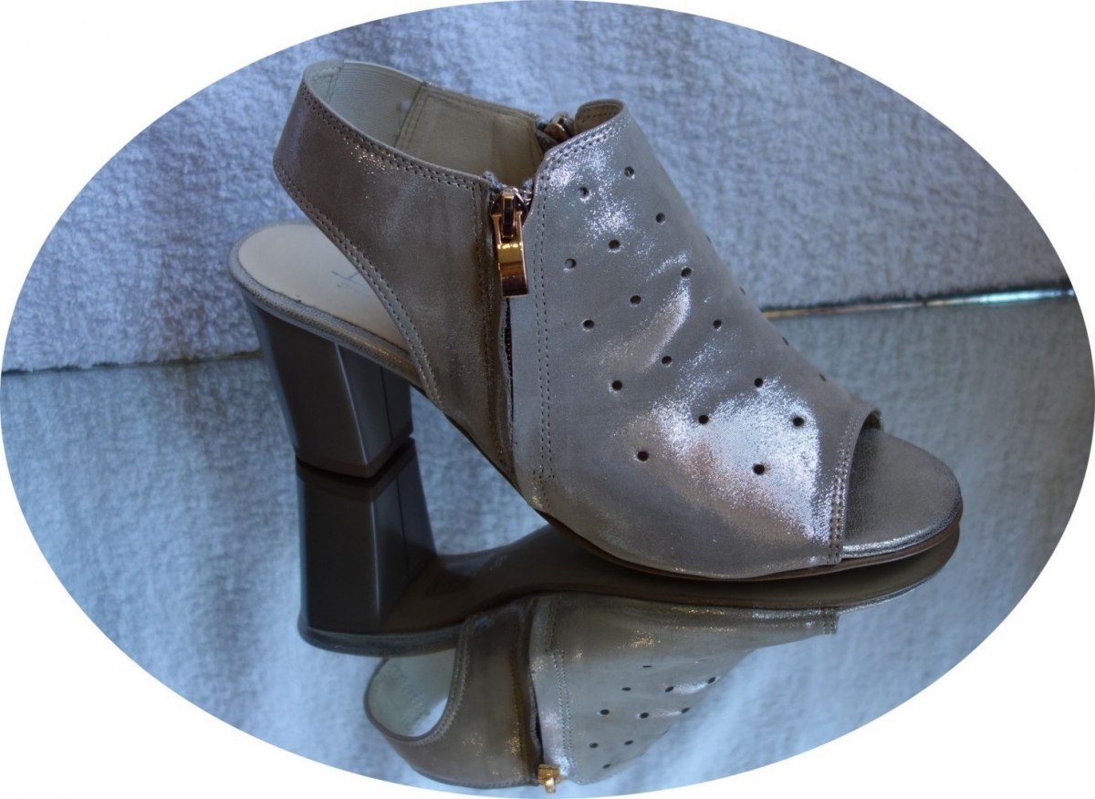 Stylish and comfortable leather sandals in gold color for women. These sandals are designed with perforations on the front and back, adding a trendy touch to your summer outfits. The side zippers are adorned with gold accents, allowing for easy and complete closure. The shoes feature a beautiful wide heel measuring 7.5 cm, providing both elegance and comfort.