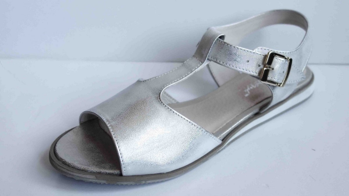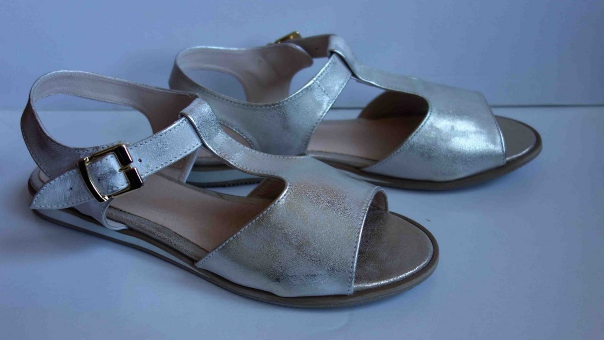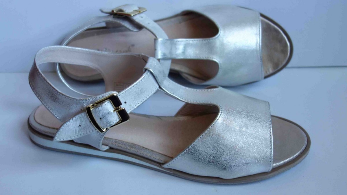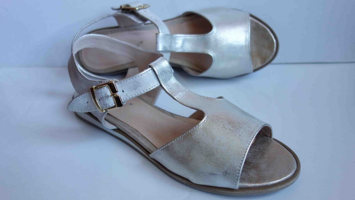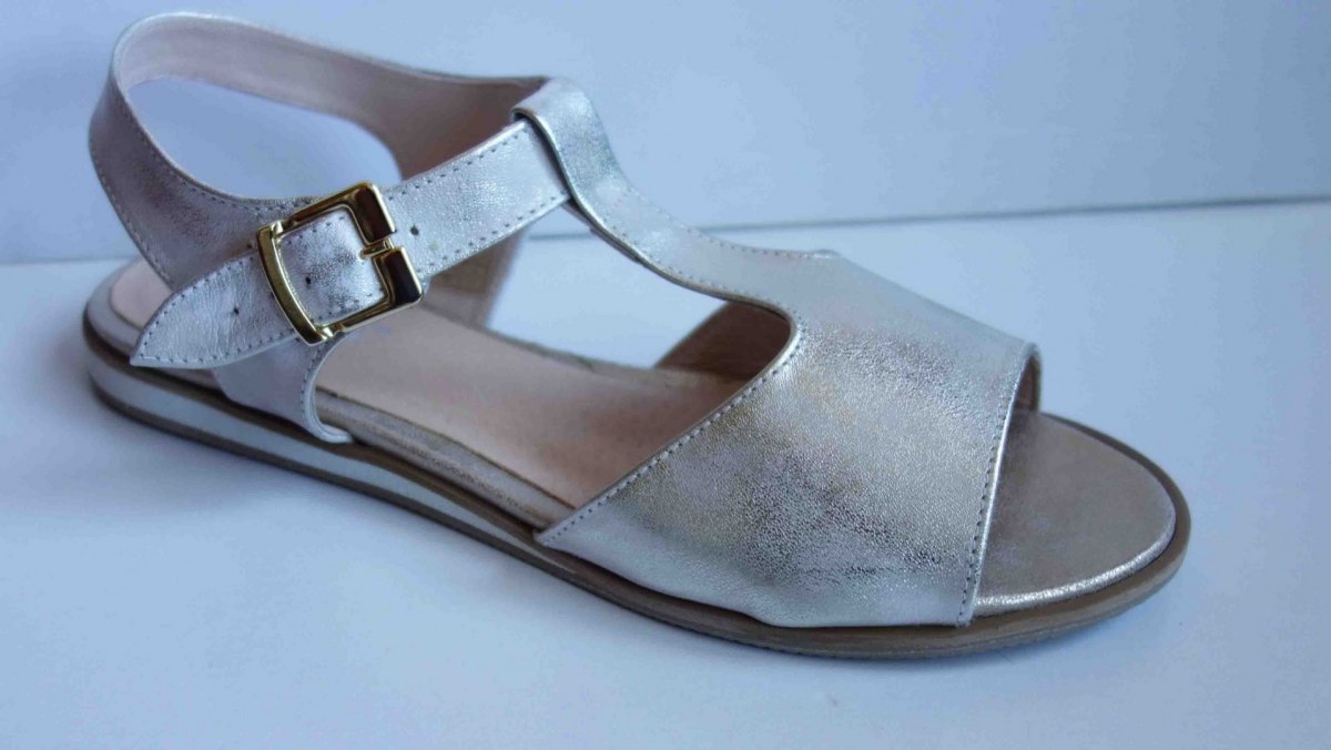 Prezentujemy Państwu modne i wygodne sandały damskie w kolorze delikatnie przecieranego złota. Buty są wykonane w całości ze skóry licowej wysokiej jakości, zarówno wewnętrzna wyściółka, jak i cholewka są skórzane. Posiadają płaską podeszwę o wysokości 2,5 cm, która jest wygodna i stabilna. W szczególności są polecane dla pań z szerszą stopą, ze względu na tęgość G1/2.