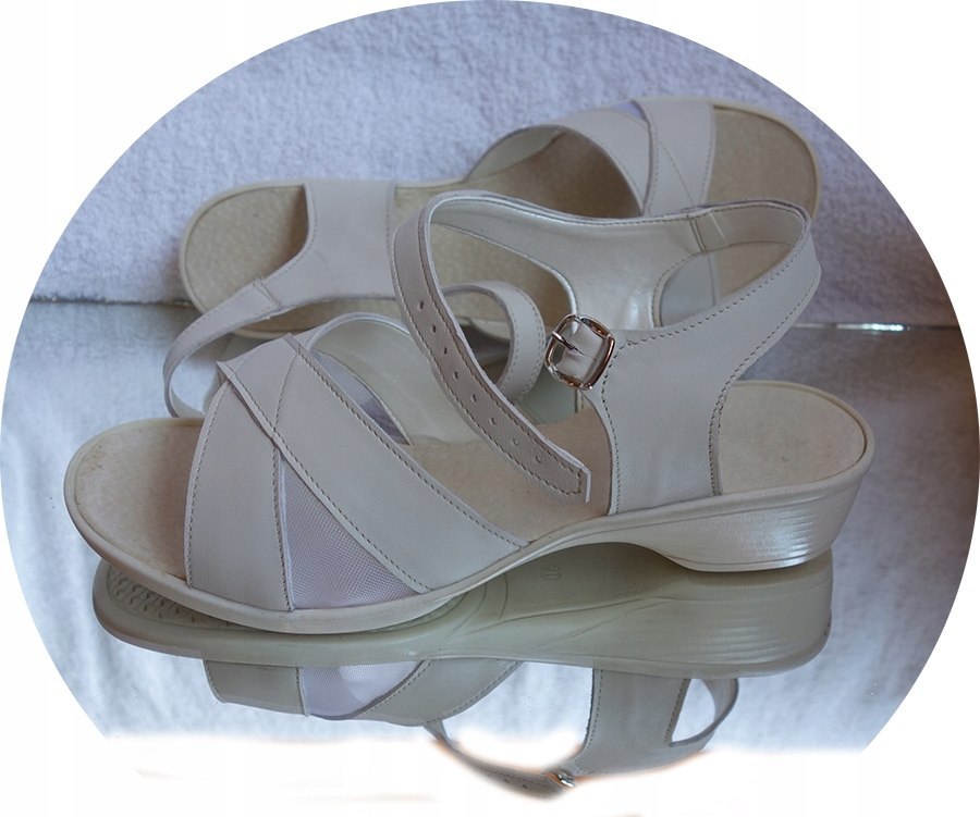 Bardzo modne i wygodne skórzane sandały damskie w kolorze ekru, dostępne w rozmiarze 41. Wykonane w całości ze skóry naturalnej, te sandały są niezwykle lekkie i miękkie, zapewniając komfort jak pantofle. Idealnie nadają się dla Pań z problemami z wysokim podbiciem i szerokością palców (haluksy). Sandałki posiadają wygodną platformę o wysokości 2 cm i stabilnym kształcie, dzięki czemu zapewniają wyjątkowy komfort dla zmęczonych stóp.