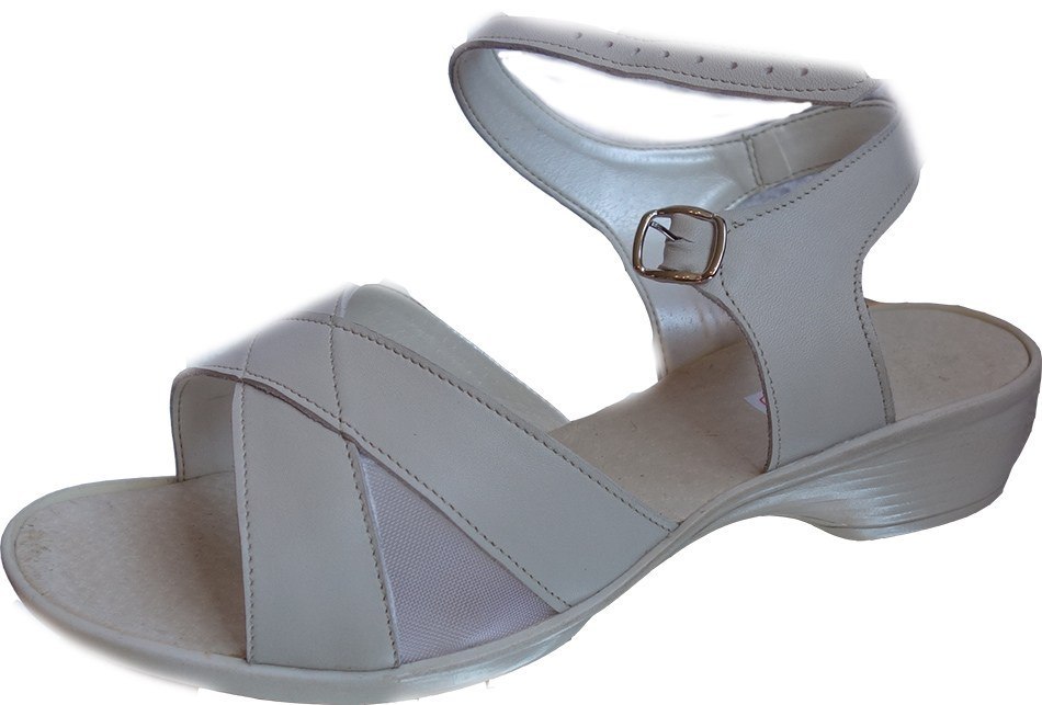 Wyjątkowo modne, wygodne i oryginalne skórzane sandały damskie w kolorze ecru (jasnym). Te sandały są niezwykle lekkie i wykonane w całości z miękkiej skóry naturalnej, przypominając pantofle. Idealne dla Pań z problemami z wysokim podbiciem stóp (haluksami), zapewniają niezrównany komfort dla zmęczonych stóp. Sandałki posiadają koturnę o wysokości 3,5 cm, która jest szeroka i stabilna.