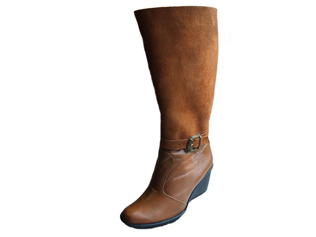 Prezentujemy Państwu te modne i wygodne kozaki na koturnie o szerokiej cholewce, które idealnie nadają się dla Pań o szerszych łydkach. Buty wykonane są z wysokiej jakości skóry w kolorze camel-brąz, co dodaje im wyjątkowego uroku. Ozdobione przeszyciami i klamrą po środku cholewki, te oryginalne kozaczki z pewnością przyciągną uwagę.