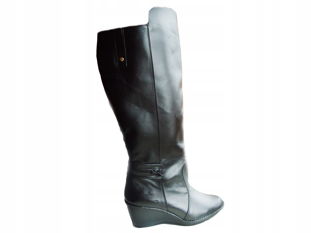 Nasz unikalny fason 100% dopasuje się do Twojej sylwetki. Koturna o stabilnej i grubej konstrukcji nadaje się na co dzień, a jej wysokość wynosi około 7 cm z tyłu i 1,8 cm z przodu. Kozaki mają wysokość cholewki wynoszącą około 38-39 cm z tyłu i około 49 cm z przodu. Ten piękny fason połączony z perfekcyjnie skrojoną skórą, bez zbędnych dodatków, doda szyku Twoim kreacjom. Dodatkowo, kozaki są mocno ocieplane grubym kożuchem, a na życzenie mogą zostać jeszcze bardziej ocieplone polarkiem.