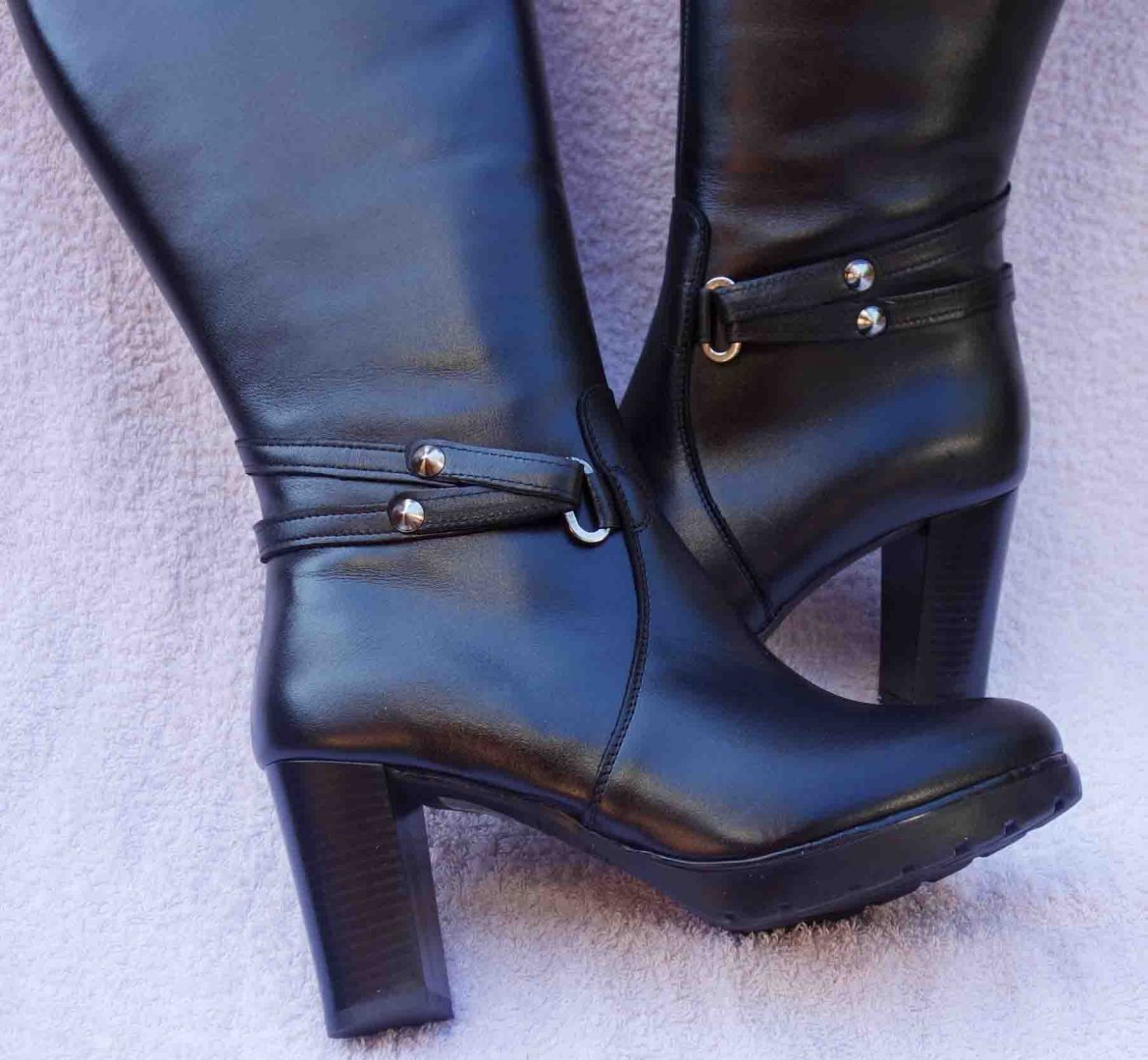 Właściwości cholewki to 40 cm, ale dzięki bocznym gumkom, które dodatkowo rozciągają się o 1-2 cm na wysokości 3/4 kozaków, jest możliwość lepszego dopasowania do łydki. Mierząc obwody łydek na różnych wysokościach (19 cm, 30 cm i 40 cm) można wybrać odpowiedni model zgodnie z aukcyjnymi parametrami.